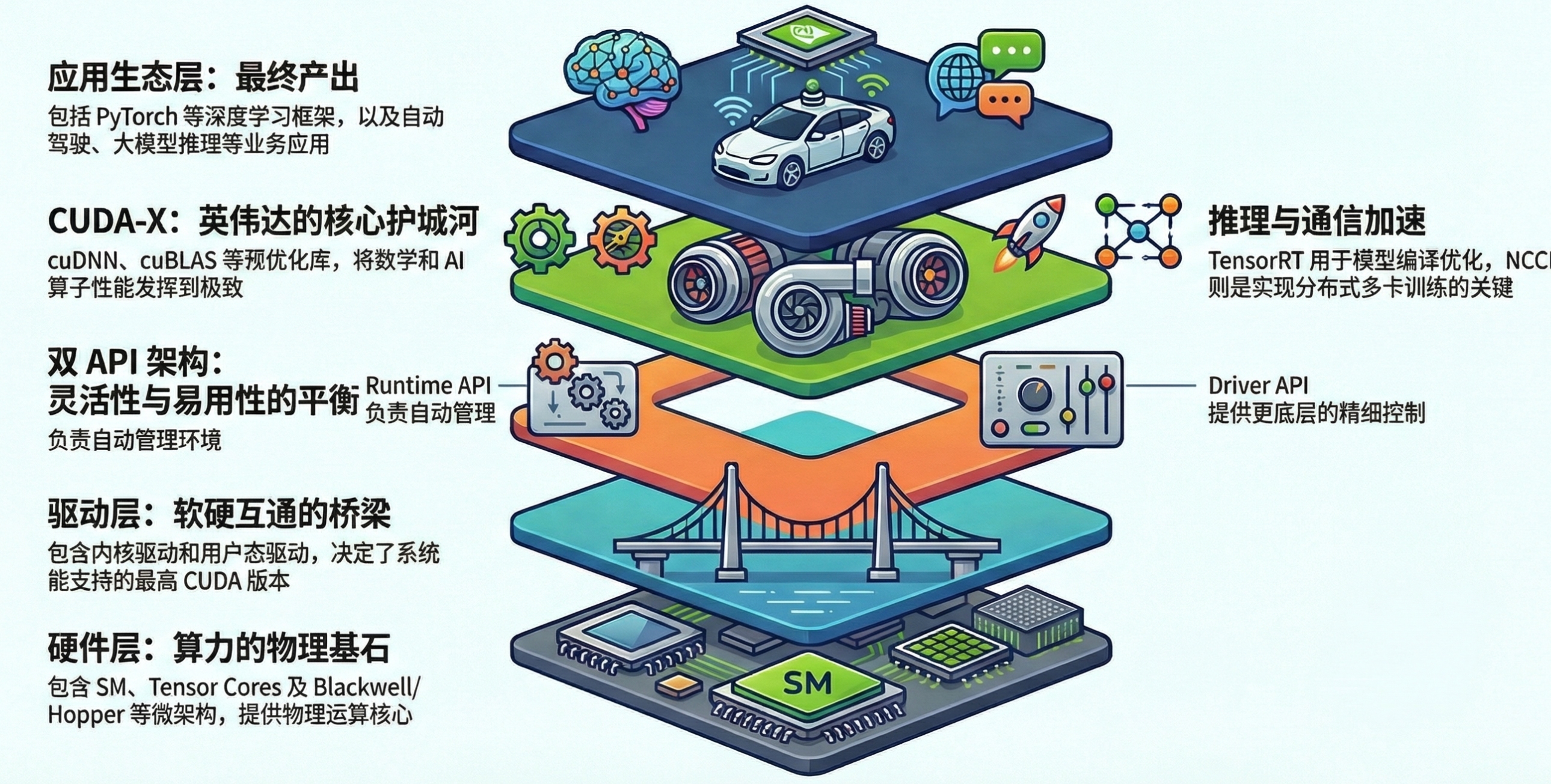 英伟达的硬件层(如 CUDA Cores 和 Tensor Cores)提供了极致的算力物理基石。虽然硬件设计极其复杂,但通过分层架构,普通开发者无需直接处理物理电路。