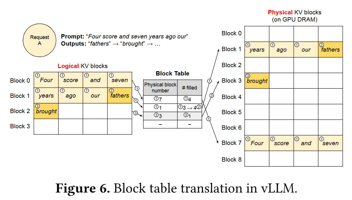 Paged attention 把 KV cache 的分配单位从“大段连续 buffer”变成了固定大小的 block。这样一来,系统只需要按需分配 physical block,不再要求为整个序列预留一整段连续空间,显存浪费通常也被限制在最后一个未填满的 block 上。