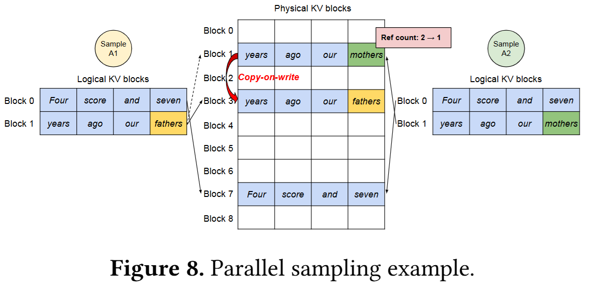 这种映射方式不仅便于按需分配,也让具有相同前缀的多个请求能够共享已有的 physical block。Parallel sampling 就是一个典型例子。