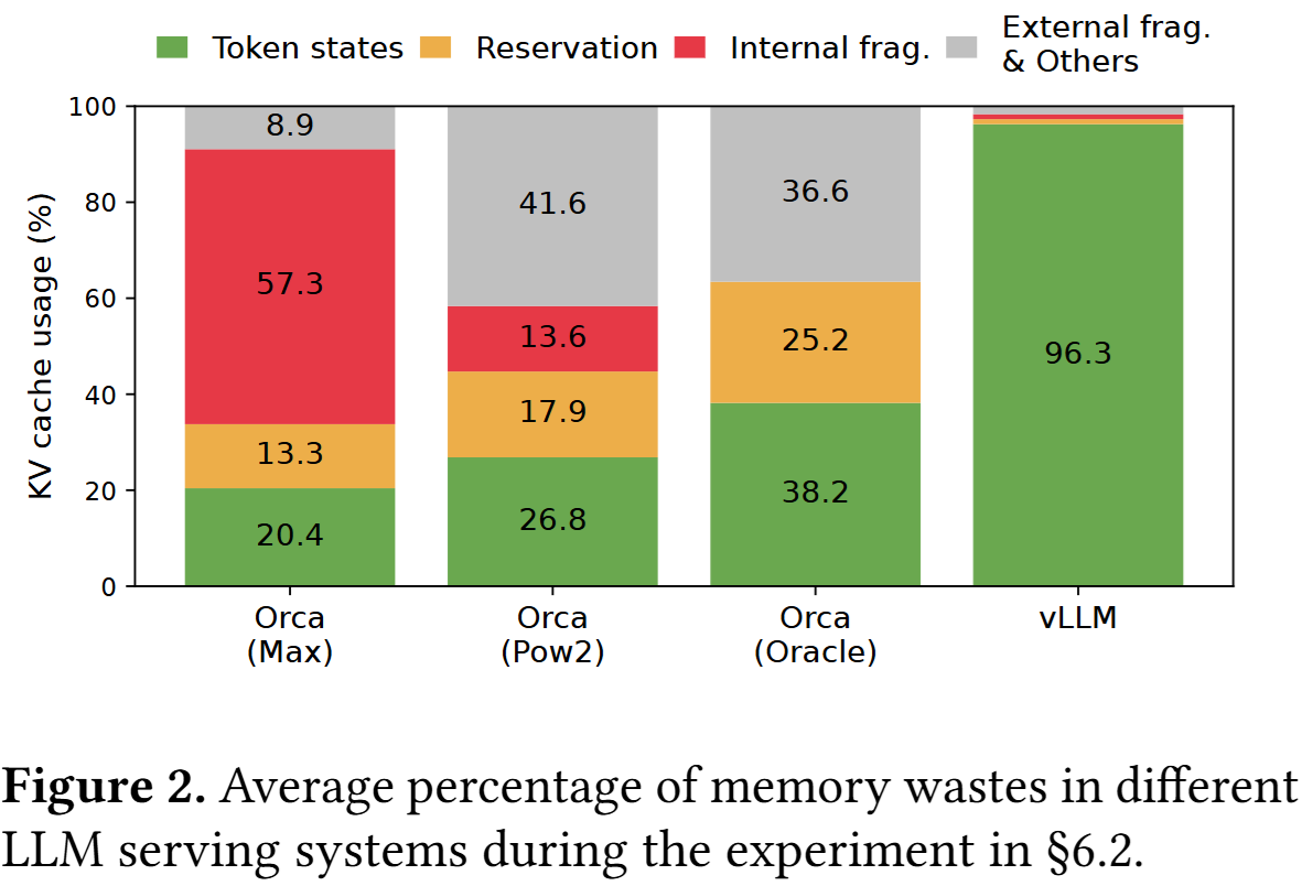 这一点可以从论文中的对比图更直观地看出来。在 Orca 系列方案中,KV cache 的一大部分空间会浪费在 reservation 和 fragmentation 上;而在 vLLM 中,绝大多数显存都被真正用于存放 token 对应的状态,KV cache 的利用率明显更高。